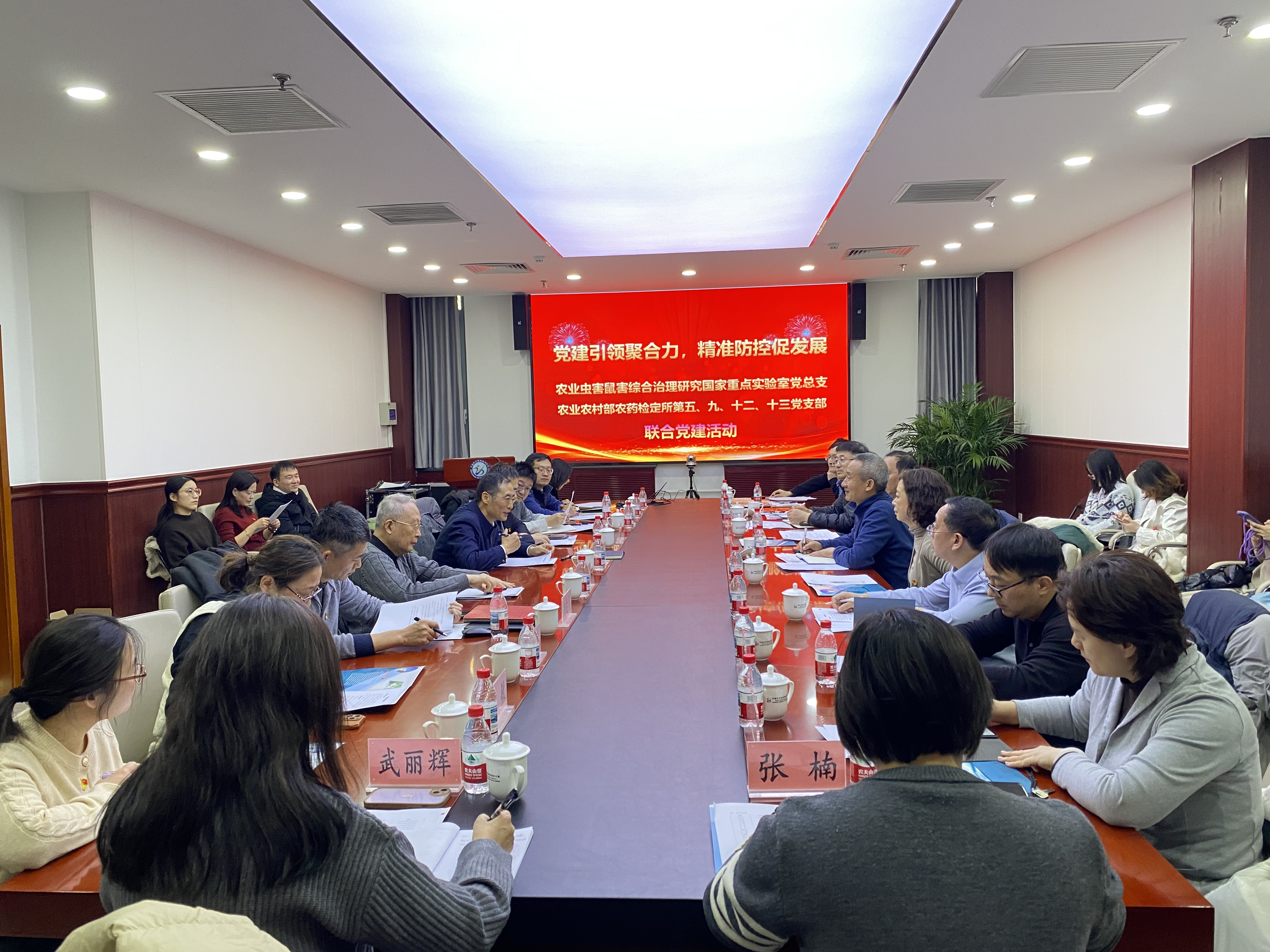 本网讯:为深入贯彻落实党中央关于扎实推进乡村全面振兴、加快建设农业强国的战略部署,推动党建与科研深度融合,1月12日,农业农村部农药检定所第五、九、十二、十三党支部与中国科学院动物研究所所属的农业虫害鼠害综合治理研究国家重点实验室党总支,联合举办“党建引领聚合力,精准防控促发展”主题党日活动。农药检定所所长、党委书记黄修柱,副所长宗伏霖,中国科学院动物研究所党委书记刘新建等50余名党员与技术专家参加。